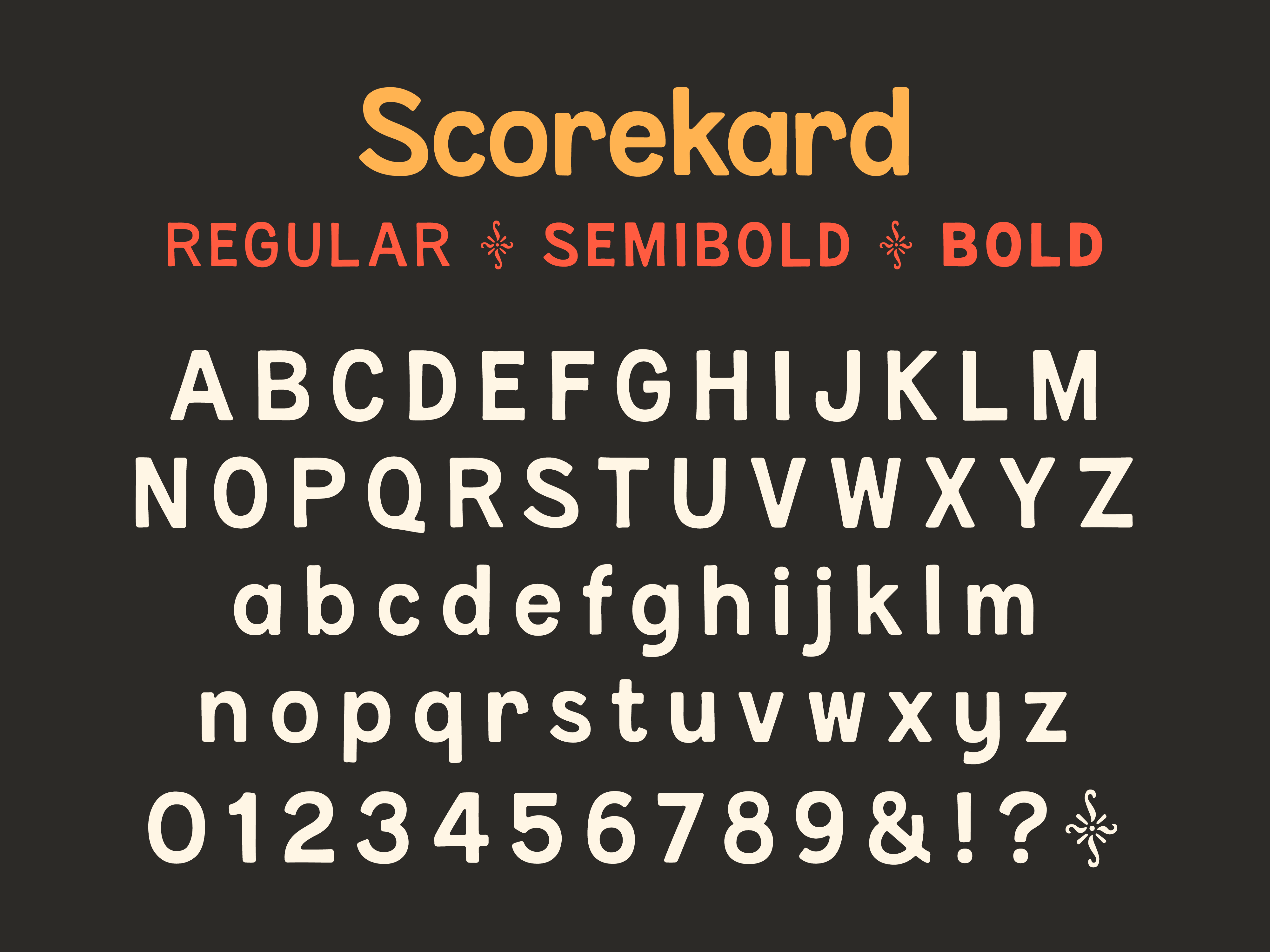 Scorekard comes with 3 weights, upper and lowercase, punctuation, and extended Latin language support with diacritics.