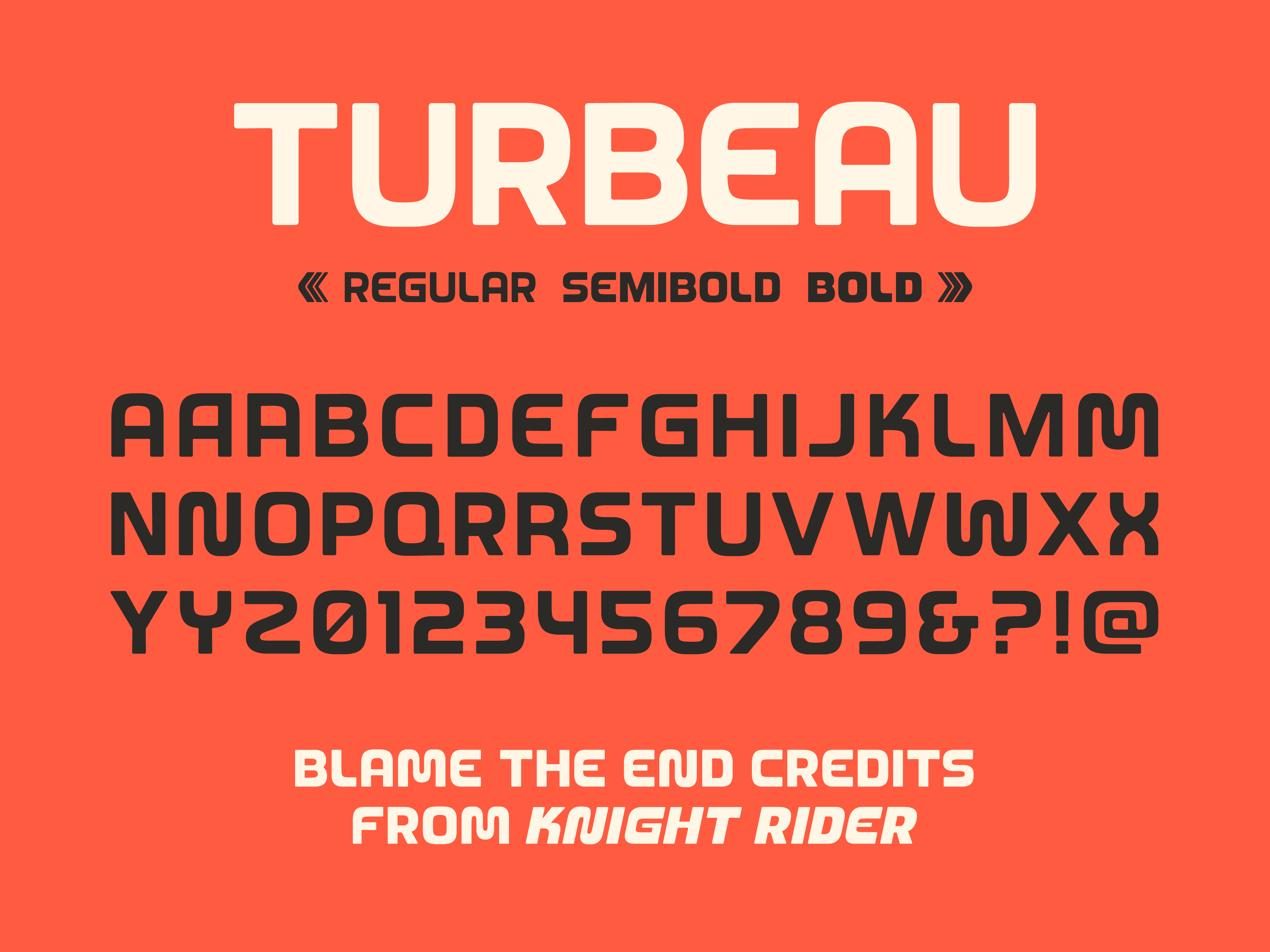 Turbeau comes in 3 weights: Regular, Semibold, and Bold. And we just had to make Oblique versions of those weights for maximum forward drive.